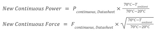 The ambient temperature can play an important role in choosing the linear motor best suited for an application. In some cases, such as operating in a hot factory environment or a confined space, the motor’s force must be derated due to elevated ambient temperature, and a larger motor than initially expected may be required. The following equation is a typical guideline for derating specified force at higher ambient temperatures.